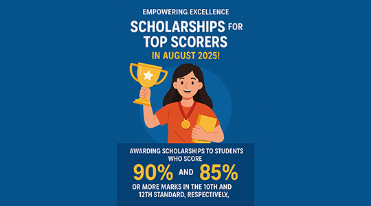 Awarding scholarships to students who score 90% and 85% or more marks in the 10th and 12th standard, respectively, in August 2025.