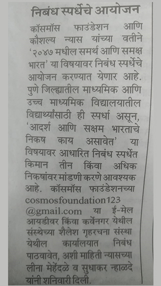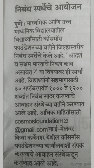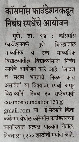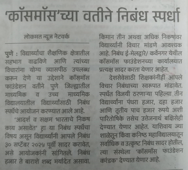 With the aim of increasing the participation of students in the educational field and providing a suitable platform for their thoughts, Cosmos Foundation has organized an essay competition for students of secondary and higher secondary schools in Pune district. The topic of this essay competition is “What should be the criteria for an Ideal and Empowered India”, and the organizers stated that the students should submit their essays before 30 September 2025.